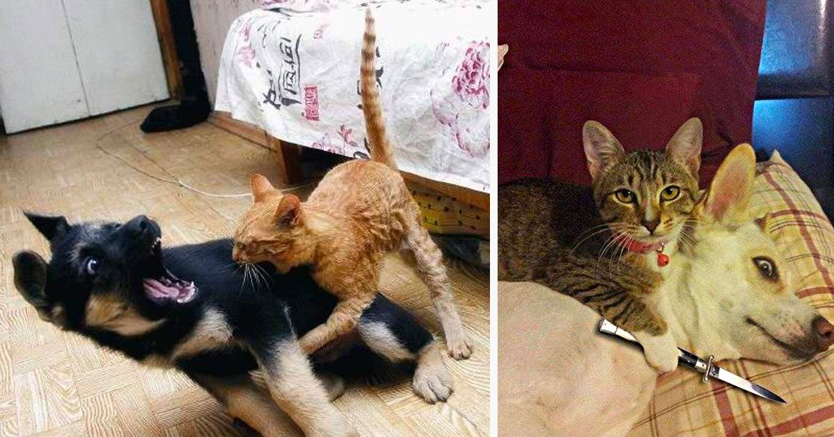 Cats and dogs both bring tremendous happiness to the world of human beings. However, when it comes to each other, it always ends in chases, claw fights and bark fests. Since their personalities and demeanors are often on opposite ends of the spectrum, friendship never seems to be a viable solution. More often than not, our sweet lovable dogs are intimidated and frightened by our fierce feline creatures. From stealing beds, knocking over food, blocking stairways, and other cruel villainous deeds, cats tend to rule all terrains, both inside and out. Here are 3o photos that display dogs who are terrified of cats!