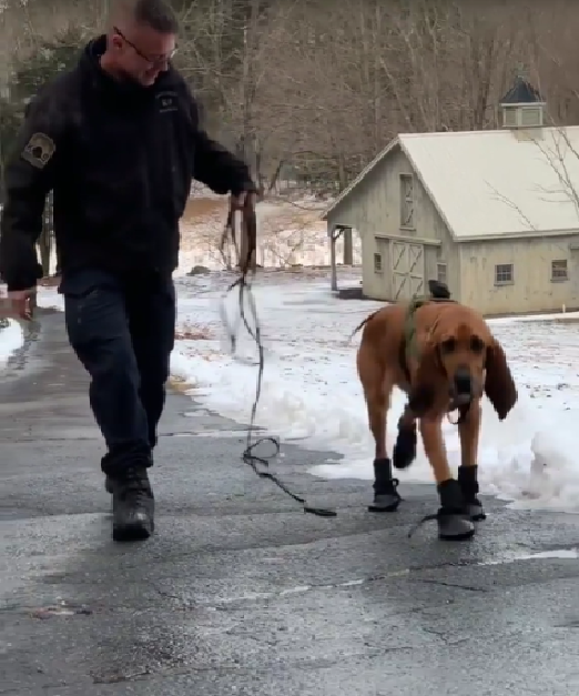 This Bloodhound police dog is trying to prepare for the long winter. He’s hoping his new boots will keep his paws warm through the icy times. Hopefully, he doesn’t slip!