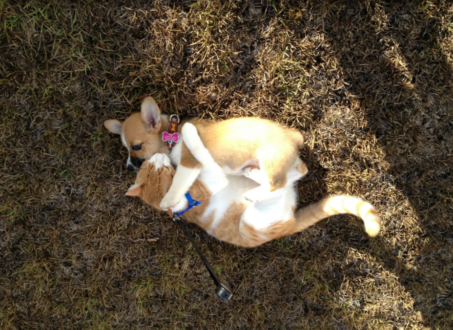 This dog and cat duo appears to finally be making amends. We can’t help but wonder, what is the cat whispering in the dog’s ears? We can only hope it’s something friendly…