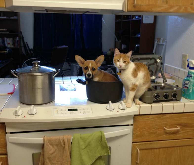 Why is the puppy in the baking pot? All signs seem to point to the feline on the right. Guilty as charged!