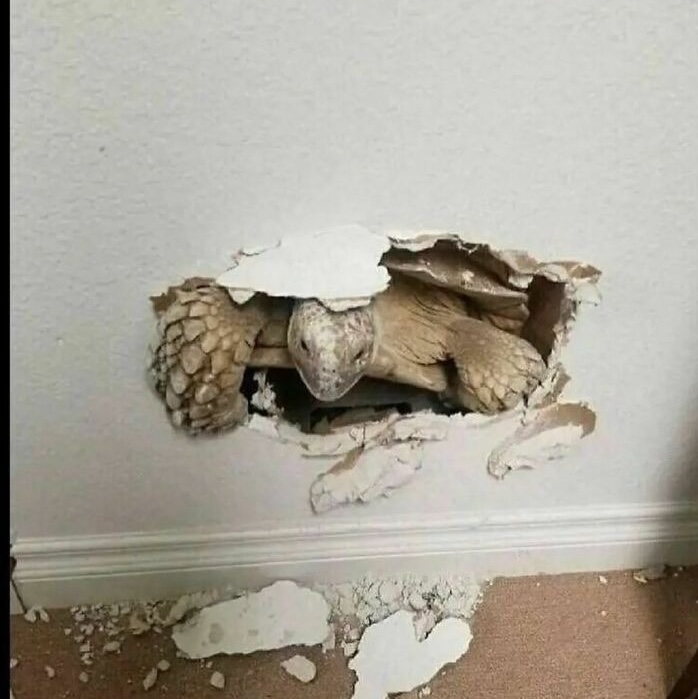 Beyond the walls, something tries to break in. It’s a turtle!