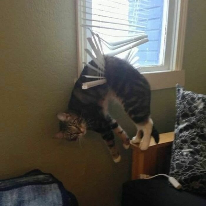 He just wanted to peek through the blinds outside. Who would have thought the blinds would complicate it?