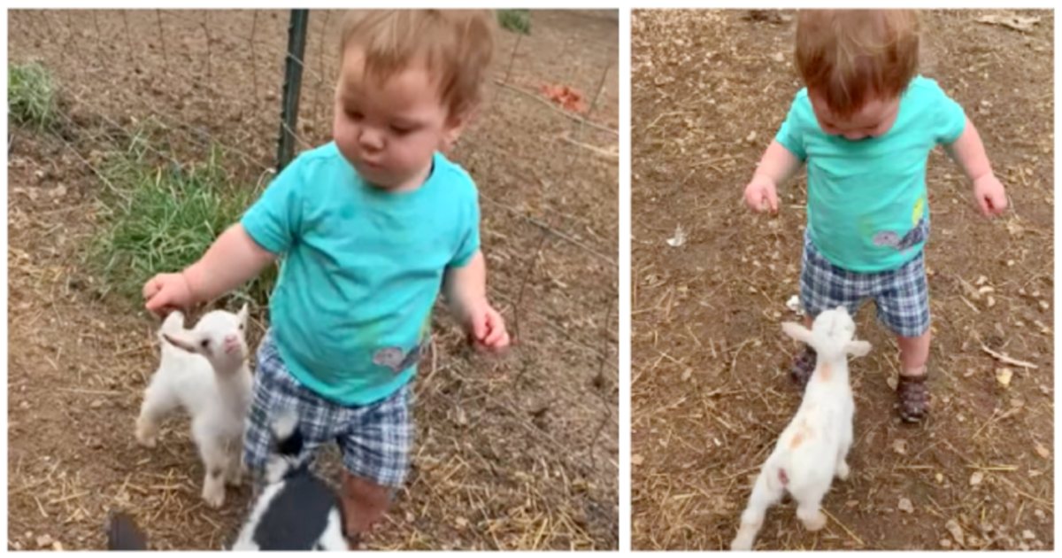 In the video, filmed by mom, we’re treated with an adorable barnyard scene: a tiny goat, who looks to be only a few days old, and a little boy toddling around together.