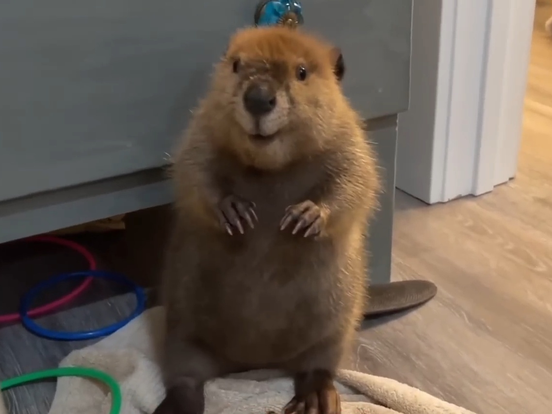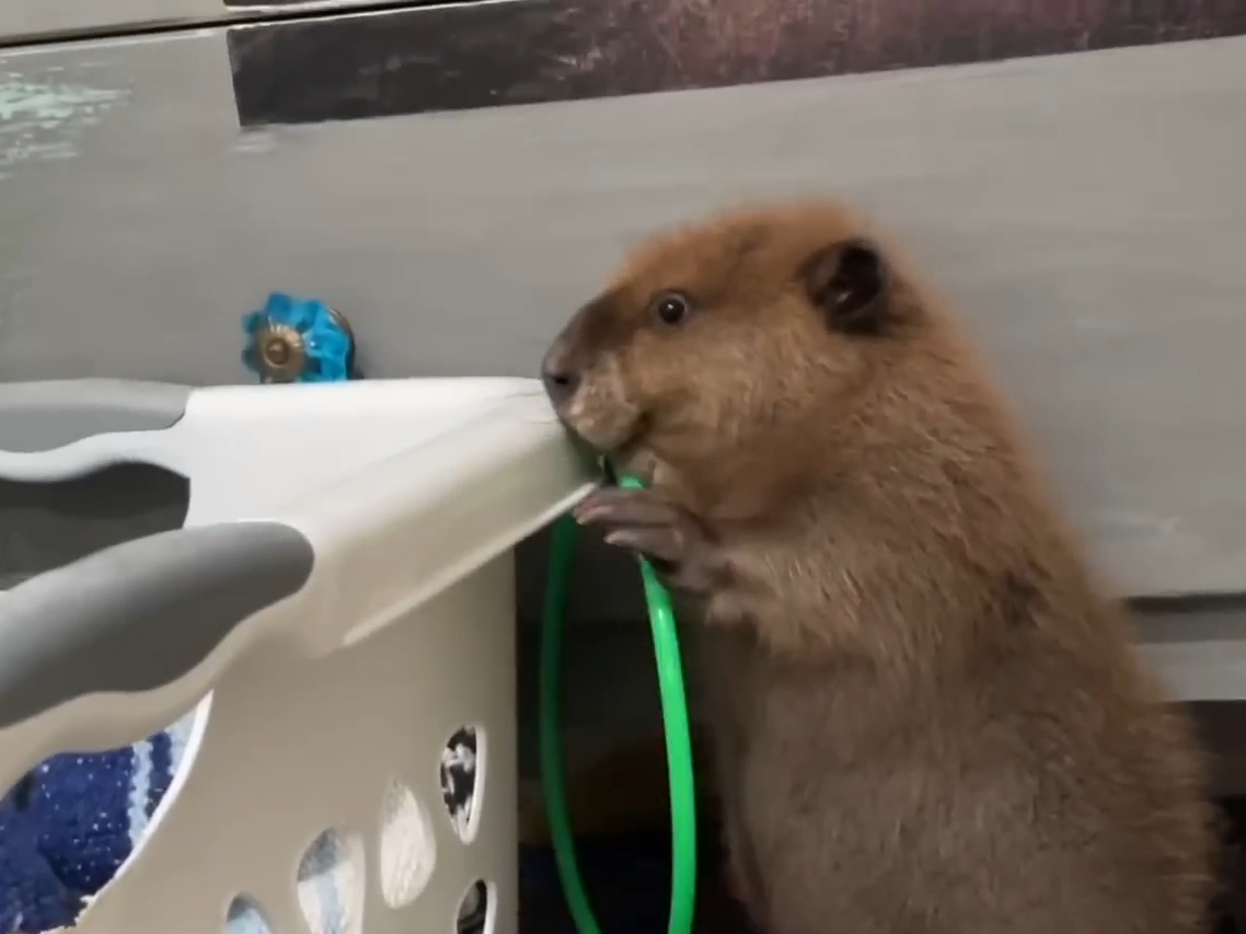 Beavers in rehabilitation, like Petunia, have a natural tendency to move things around, often creating piles or dams inside the house.