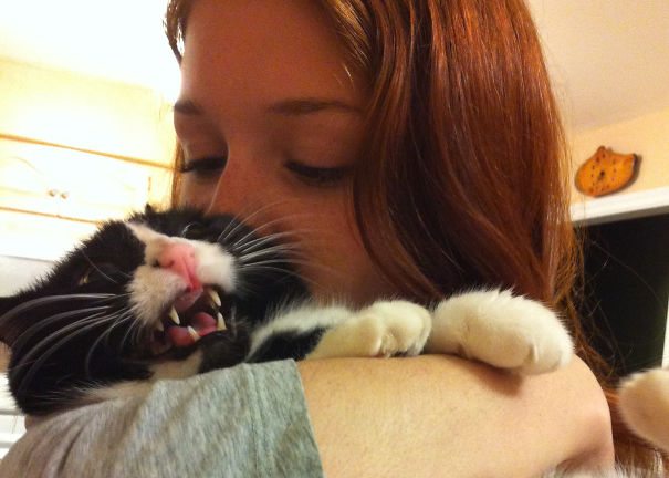 12. She wanted to capture a cute phto with her cat and her boyfriend. She caught this special moment instead.