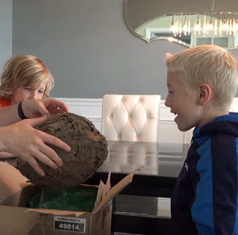 Once cracked open, Dan gave the camera a quick glimpse of the inside of the nest before passing a half of the nest to each boy for a closer look.