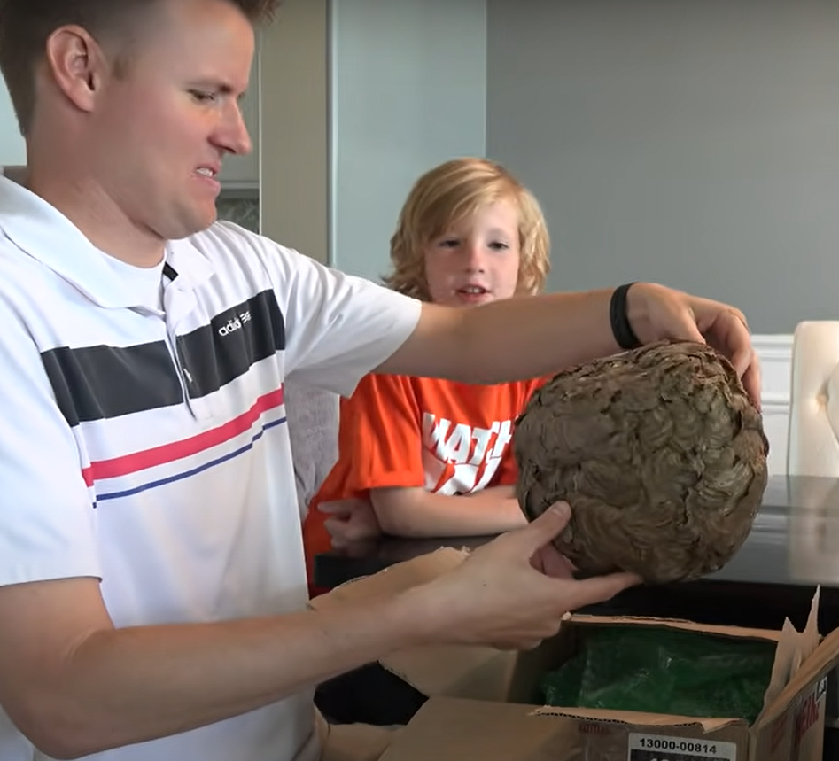 The father revealed the nest he ordered came from Wisconsin. As the three unboxed the nest, they braced themselves in the off-chance wasps came flying out of the box. Though, it seemed unlikely given the travels of the box to get there.
