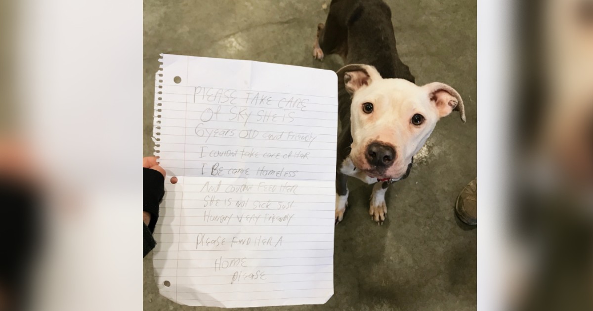 “Please take care of Sky,” the note said. “She is 6 years old and friendly. I couldn’t take care of her. I became homeless and couldn’t feed her. She is not sick, just hungry, very friendly. Please find her a home. Please.”