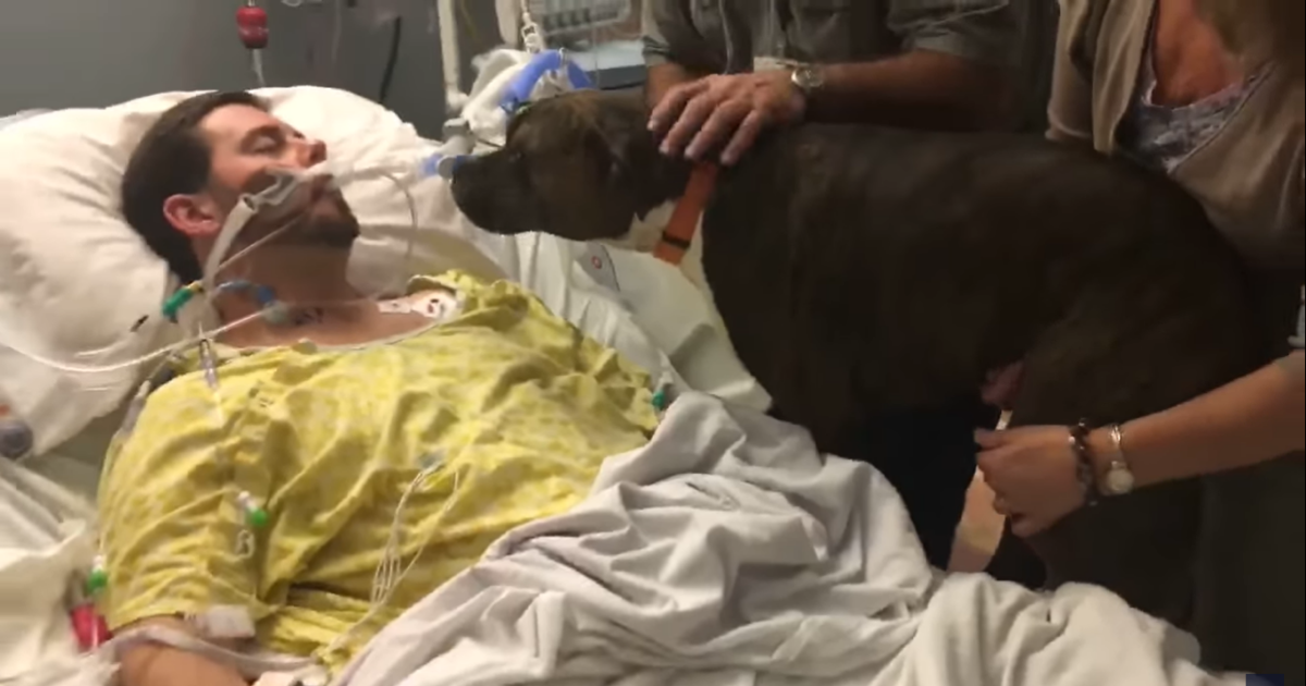 Ryan’s face is covered with a number of tubes which are helping him to breathe, but it’s clear that Molly still recognises her owner. She seems confused as to why he is lying so still, but it’s as if she’d picked up on the emotions in the room, as she appears incredibly calm and sombre.