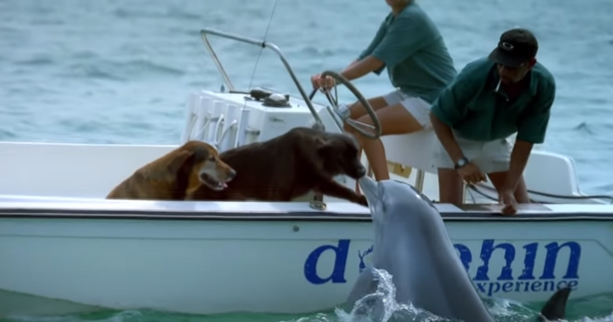 In the short scene, we see two men on a boat with two dogs. As a pair of dolphins swim up alongside the boat, the pups are mighty curious to see what’s coming out of the water and begin wagging their tails.