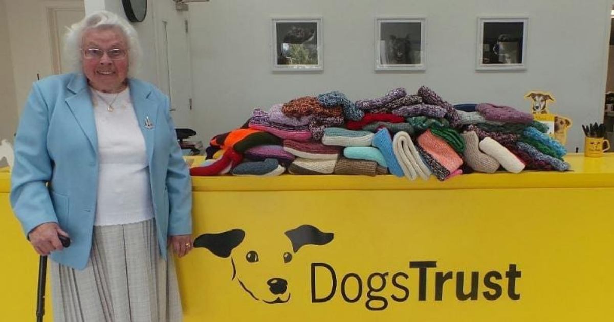 “Local dog lover Maisie Green aged 89 years hand knits blankets and dog coats for Dogs Trust Basildon. Over the years she has knitted an estimated 450 items for the dogs at the centre to enjoy. Thank you so much Maisie!”