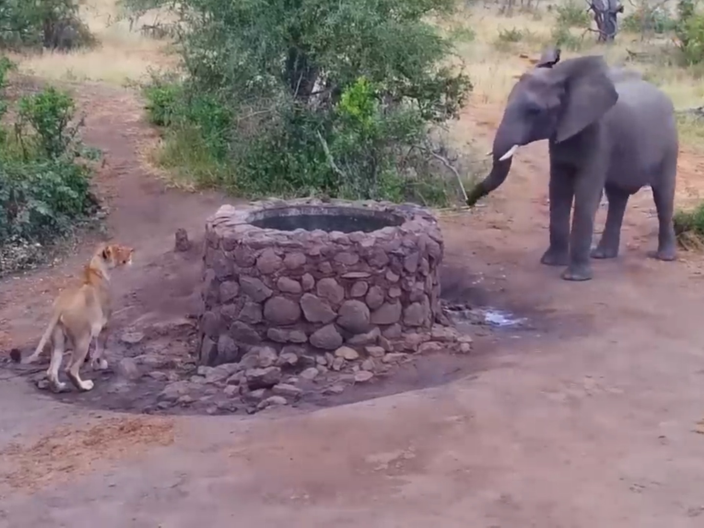 As the lioness leaned closer, the elephant startled her with a surprise attack.