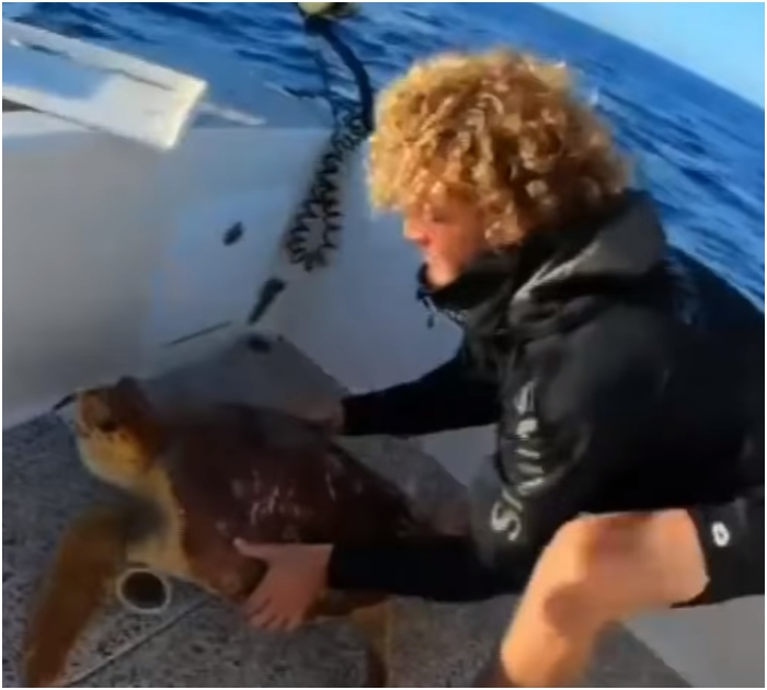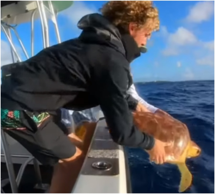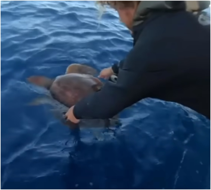 As they approached a safer part of the ocean to release the turtle, a remarkable interaction took place.