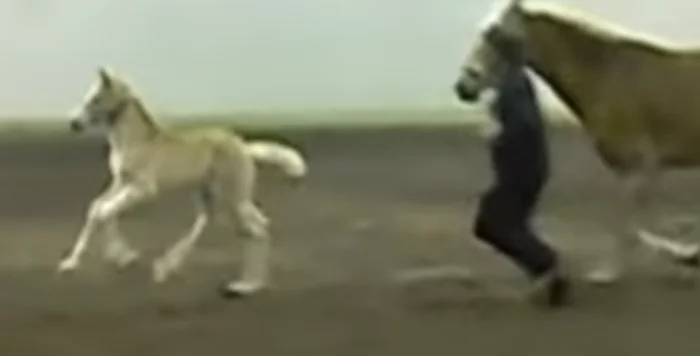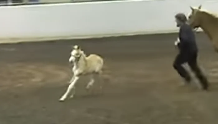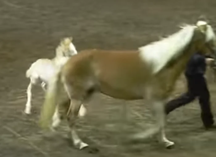 Blitz, a young foal, was being shown off to the crowd with his mother and their trainer during The Parade of Breeds.