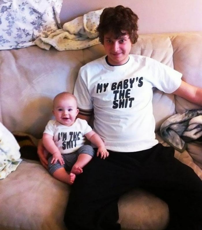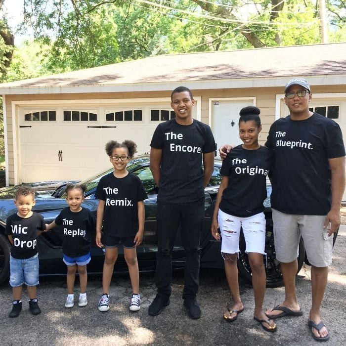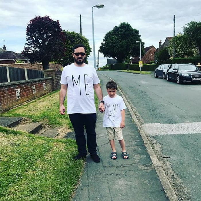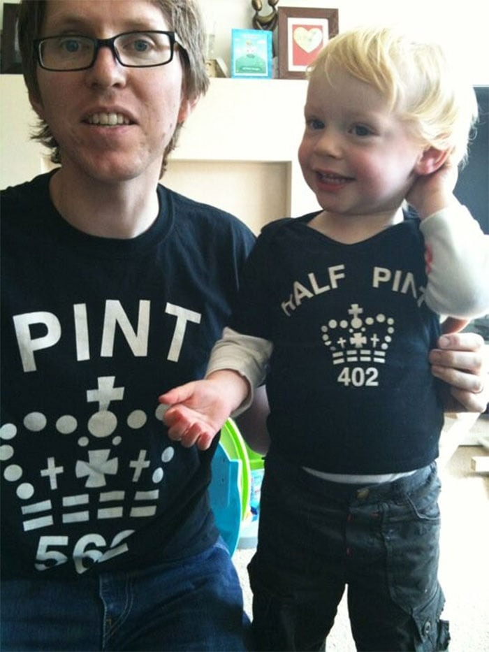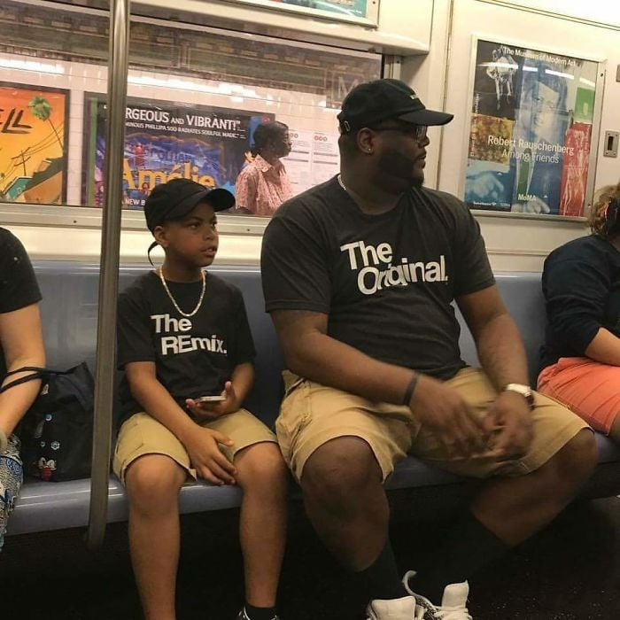 Dad’s rocking the “Original” shirt, while his son proudly sports the “Remix.”