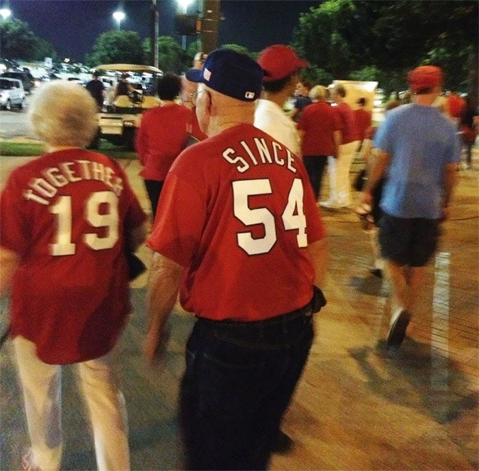 Their matching shirts proudly let the world know just how long their love has lasted.