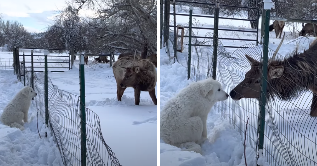 Incredibly, her dog didn’t scare them away at all! Her puppy, a five-month-old Great Pyrenees, blended in perfectly with the stark white snow. Lauren watched as he slowly walked up to one of the nearby elk and gave it a kiss right on the nose!