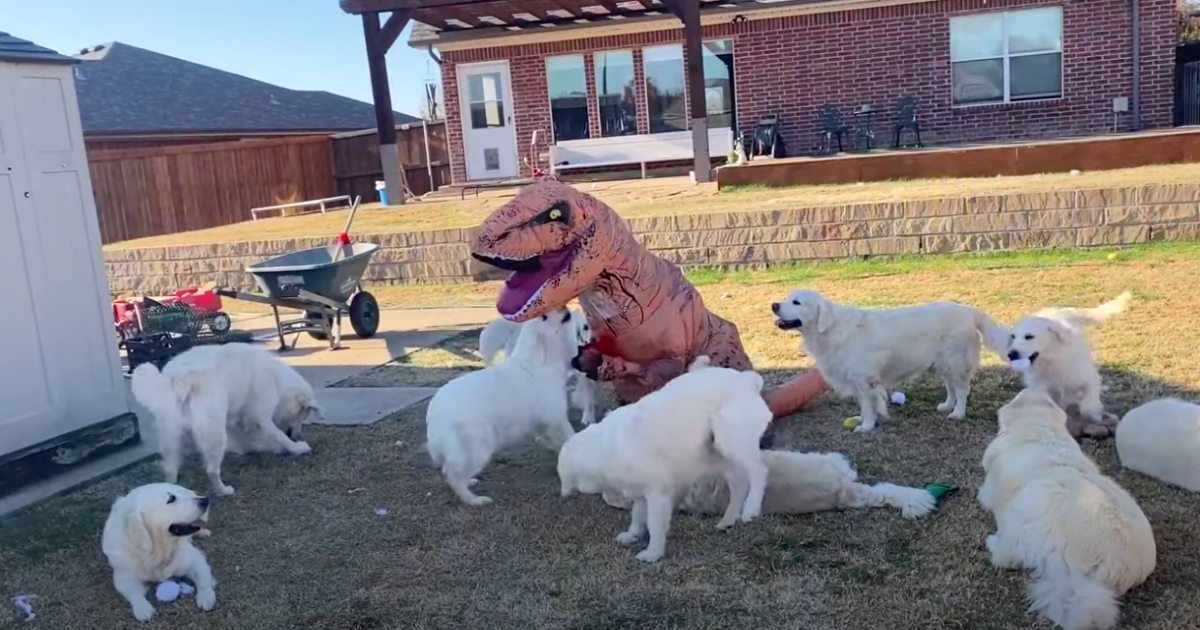As the man prances around, several of his Golden Retrievers stay right on his heels. From their reaction, you have to wonder if he’s done something like this before. They’re super happy and eager to play with their new big dinosaur friend.