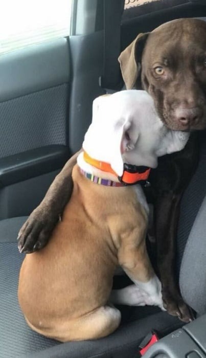 Every time their owner takes them for a car ride, the little pup gets anxious—but the big brown dog always knows how to calm them down with a bit of cuddling and love.