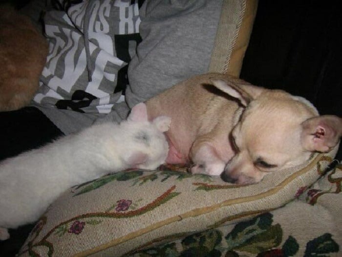When this person’s 12-year-old cat licks her 11-year-old dog, the pup looks a bit confused.