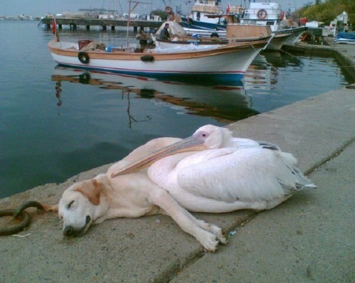 This is a rare sight. After being homeless for a long time, this pup befriended a pelican.