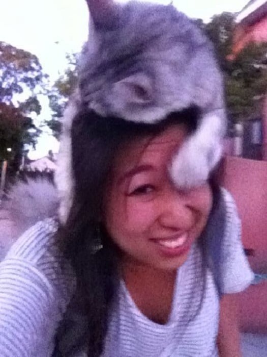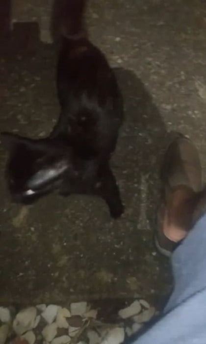 While out walking, this cat suddenly appeared and jumped right onto the lady’s head.