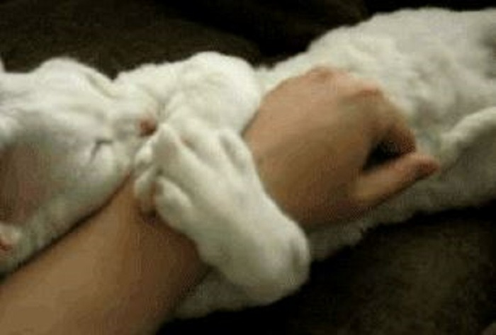 When this cat’s owner gives him belly rubs, he wraps his adorable paws around her arm and buries his face in her hand.