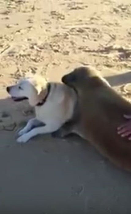 While walking on the beach, this dog’s owners never expected a seal to waddle over and make friends.