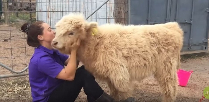 This fluffy calf absolutely adores hugs and kisses from his owner—and honestly, who wouldn’t want a pet like that?
