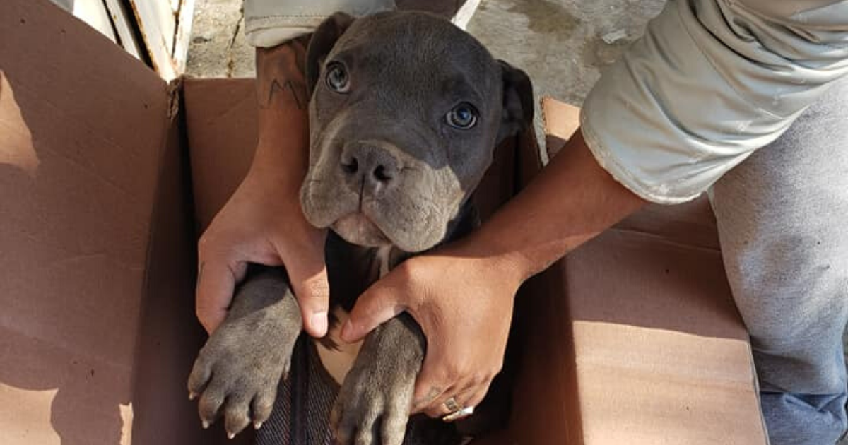One day, they found a cardboard box outside their door with a dog in it.