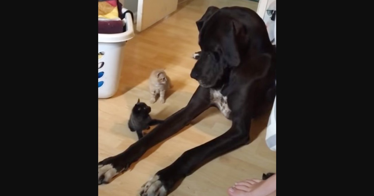 Bagheera the Great Dane was more than a little overwhelmed when his kitty sibling gave birth to some kittens. A video shared by Rumble Viral captures his first impressions of the tiny kittens, and it’s clear that he’s caught the eye of one little black kitten in particular.