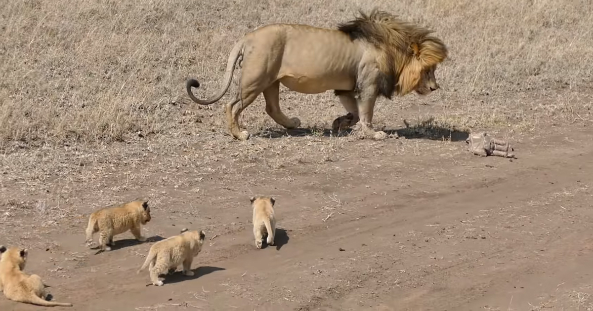 One by one, the four cubs get up and start following the father. They start whining out for their dad.