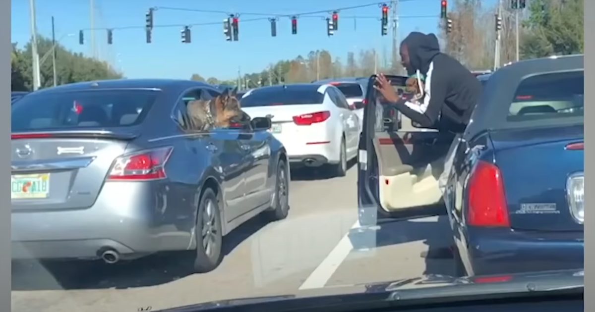 As you can see, a big dog is peeking outside the car’s window, and it seems to have caught the interest of the other car beside them.