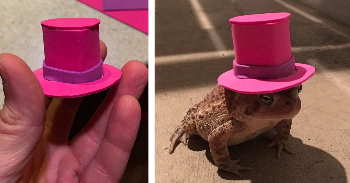 The toad kept coming back every night, so Chris created more fun hats for him to wear. He went for a Western theme and made the toad a little cowboy hat and lasso.