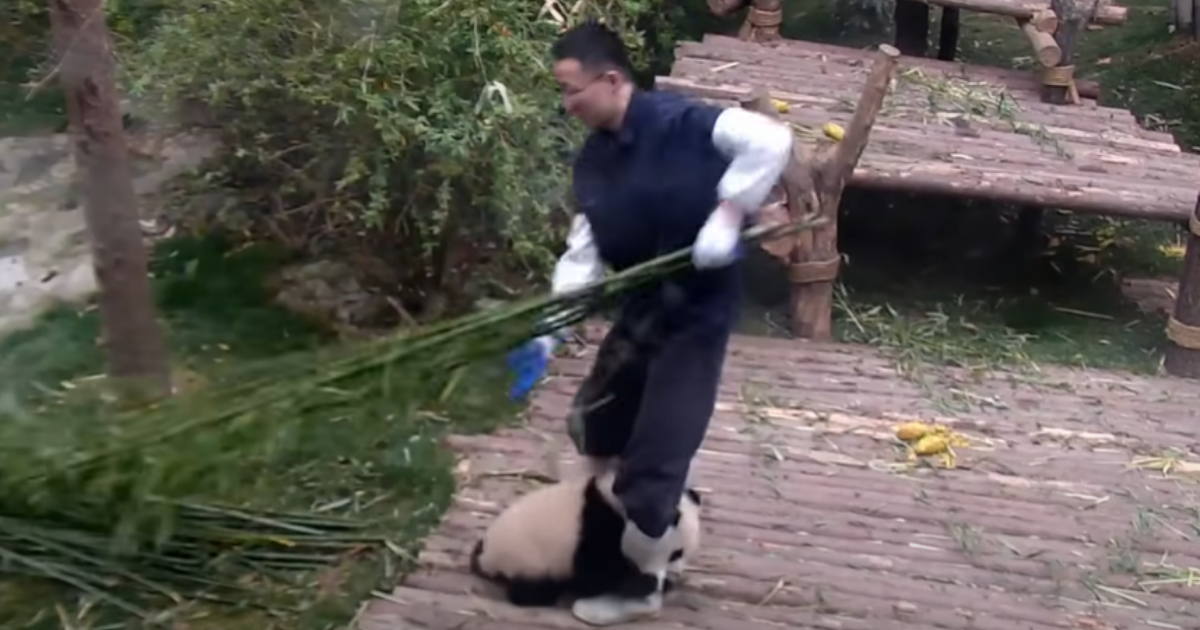 In one particular conservatory in China, one of the workers had the task of arranging bamboo stalks inside the pandas’ pens for their food. But as he set to work, he was immediately slowed down by one particularly clingy panda.