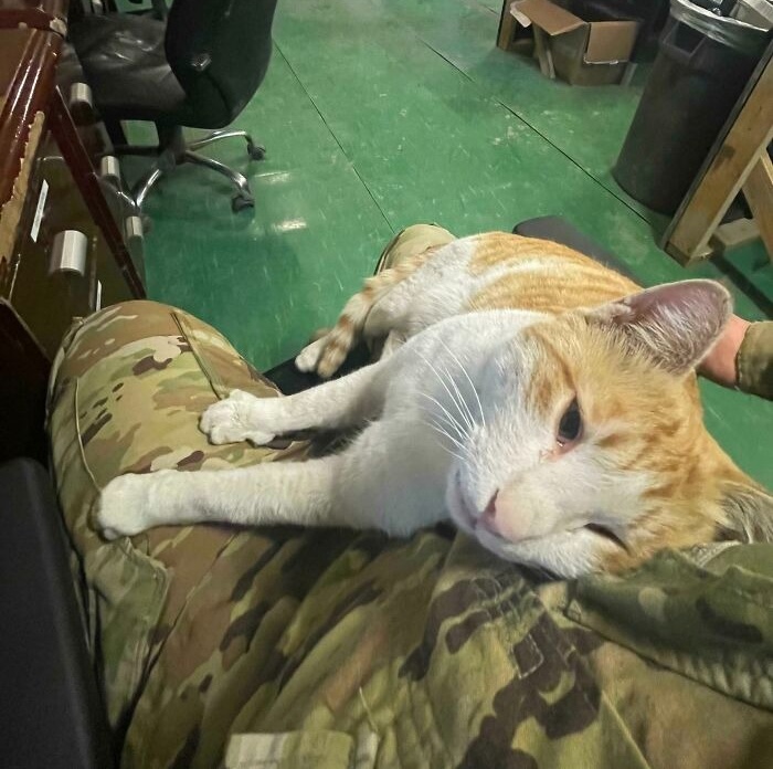 This is Colby Jack or CJ. He’s a stray cat in Iraq who adopted the Redditor and his platoon. Lucky platoon!