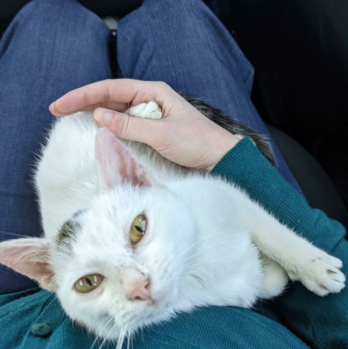 This cat is an amputee. The person who wants to adopt him is also an amputee. They’re going to live together now.