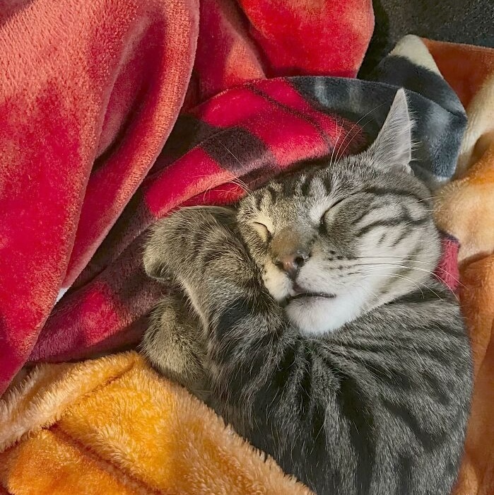 They called him Stinky Boy at first because he was wet from the rain. Now, he’s just a warm and fuzzy boy, who gets to snuggle under all the blankets he wants.