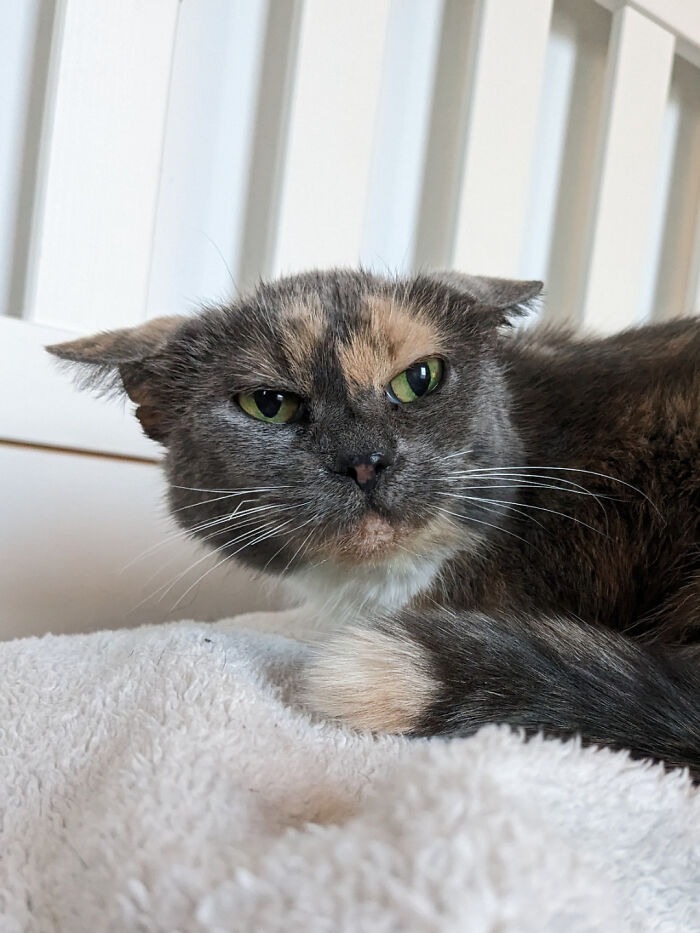 We are so glad her human adopted her. She was initially bought from a breeder and dumped at her human’s co-worker’s house, who has never owned or wanted a cat. This cute little kitty had to fend for herself every time she wanted food because her previous human never gave her food. Now, she doesn’t have to worry about food anymore. Although her human needs to train her to stop scavenging for food.