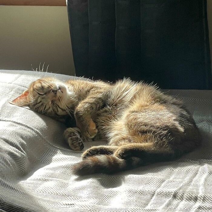 He used to sunbathe while living in the streets. Now, he just had his first bath in his new home and sunbathing with his new family.