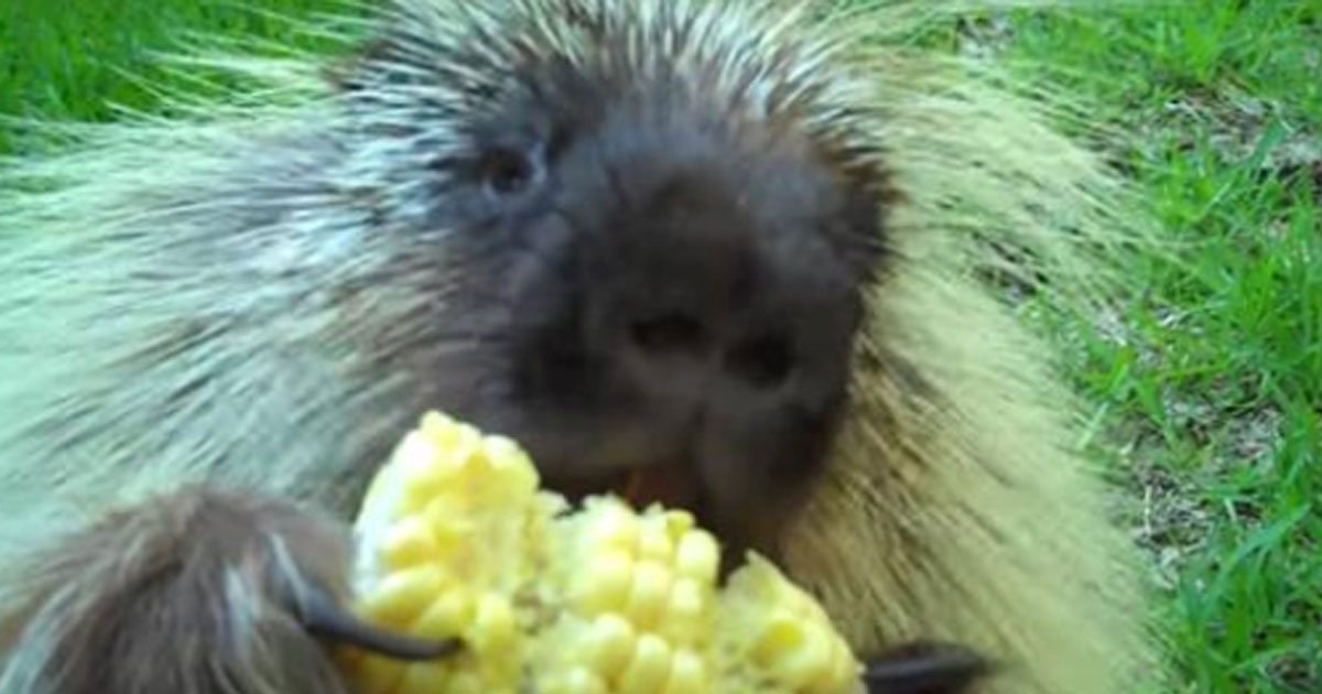 Finally, she gives up and leaves him along with his treat. He continues to eat it and make little noises. He clearly loves corn, and his owner clearly loves him. The video was shared on YouTube, and everyone seems to be smitten with the little porcupine. Some of the viewers tried to make out the words the porcupine was saying.