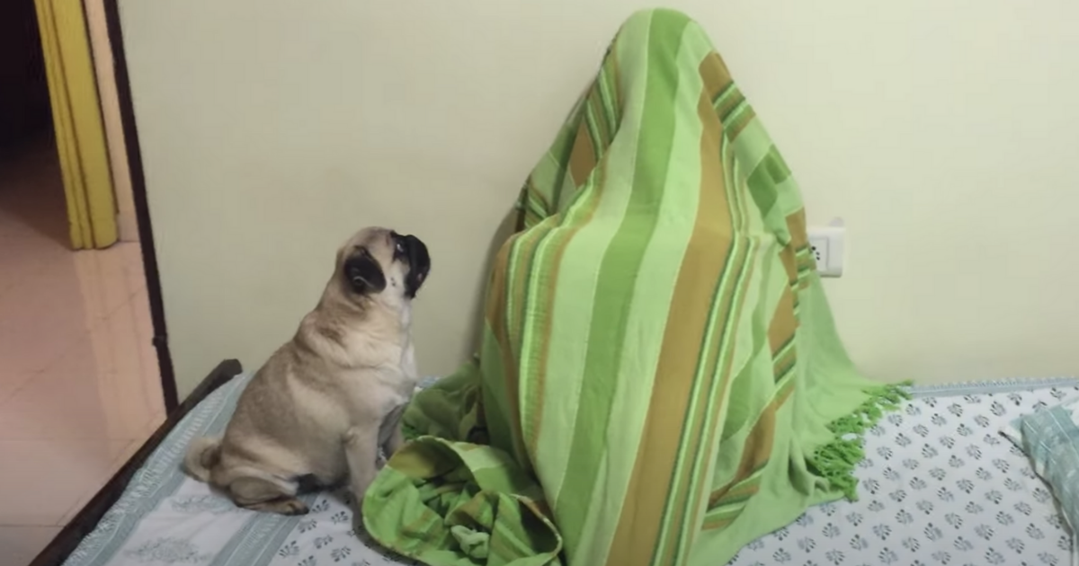 This pug is pretty smart too – he knows the phone owner is the one under the blanket because he paces between the two items.
