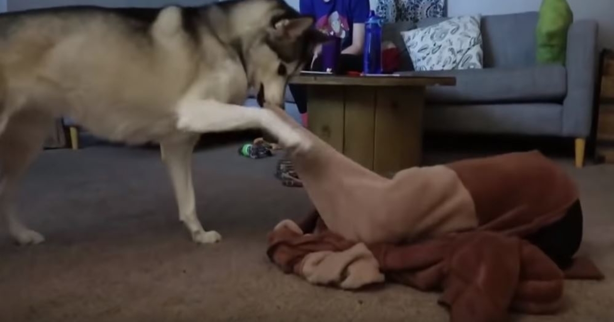 From the owner’s comment, Oscar’s been inside of this thing for about 10 minutes. After sniffing the pup for a few seconds, Nora tugs a little bit on the onesie. Then, she seems confused as to what she should do next. So, she puts her paws on the ground and her butt in the air while talking to him in Husky language.