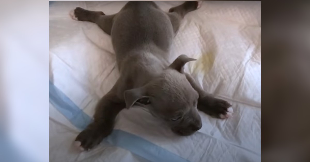 The adorable grey pit bull was splayed down on the floor when he emerged into this world. According to his Facebook page, the affliction is called “swimmer’s syndrome.”