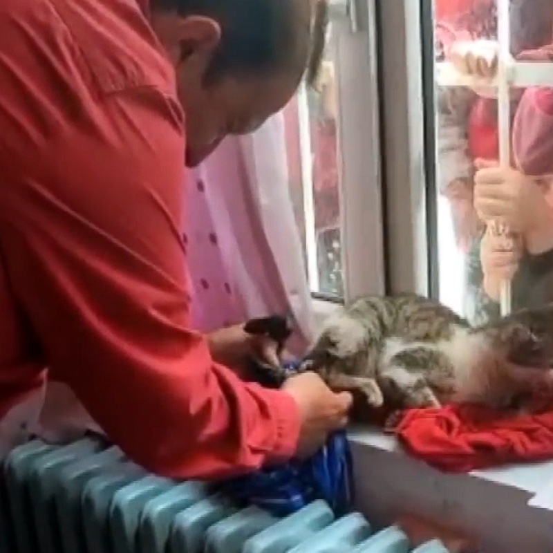 The teacher rushed to get a bag and some rags to help the cat give birth.