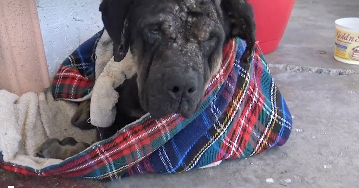 They drove to her place right away, and there they were, this big black dog wrapped around the blankets. The poor dog looked like he had given up on life. He was full of scabs and wounds, so the rescuers thought of bringing him to the vet.