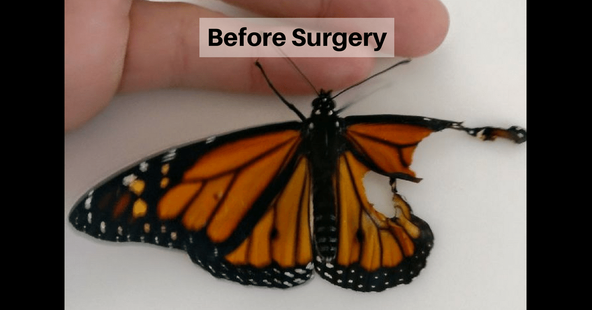 Given that Romy is a costume designer and great with a needle and thread, she decided to turn her home into a small operating room for the unfortunate Monarch butterfly. In a sad coincidence, Romy had another butterfly pass away the previous week, so she had an ‘extra’ pair of wings to use for the operation.