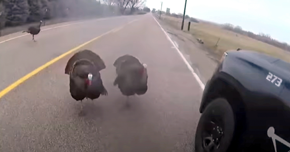 After a going a few rounds with the turkeys the cop decides to give up. ”