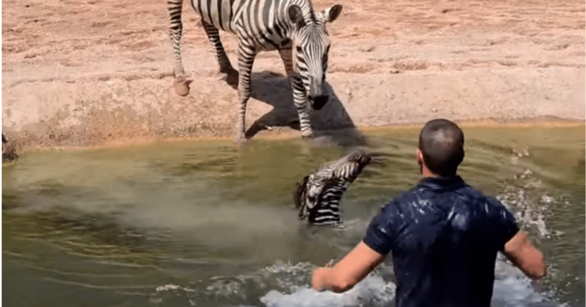 As the baby stood, he lost his balance, and to everyone’s shock, he fell into the watering hole. The little zebra immediately started panicking, and the zookeepers knew if they didn’t do something, the baby was going to drown.